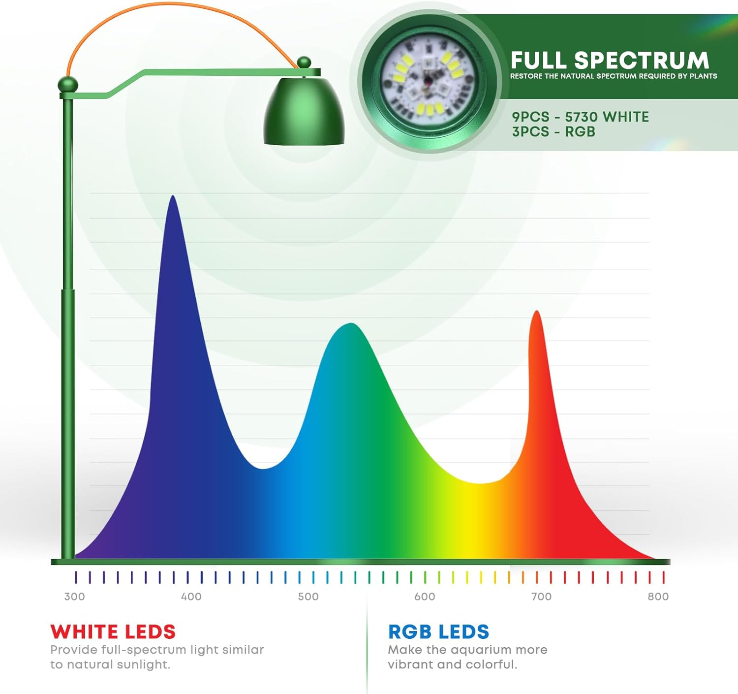 Features 9 high-brightness white LEDs and 3 RGB LEDs, delivering a full-spectrum light source that supports healthy plant growth and enhances the color and vibrancy of your aquascape.