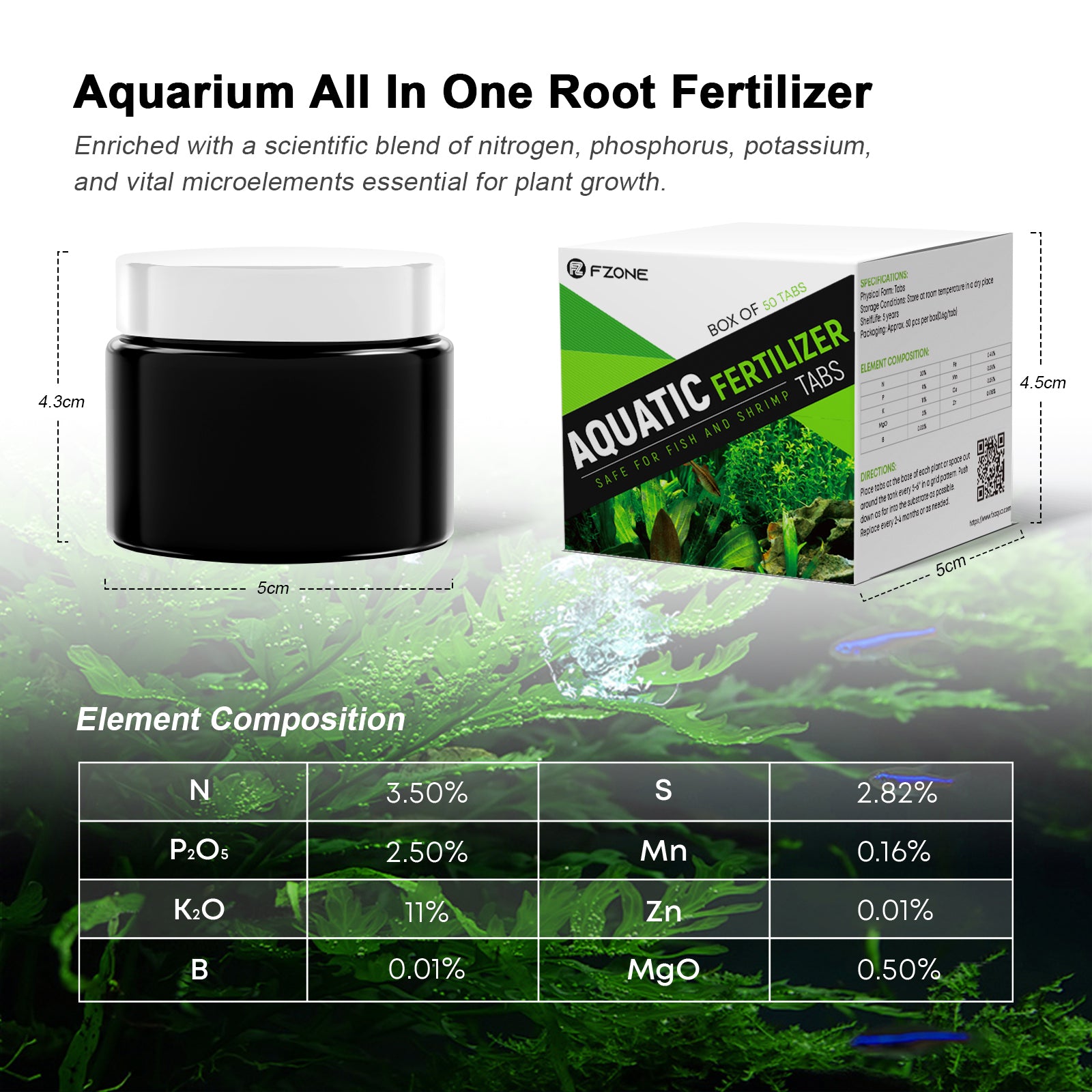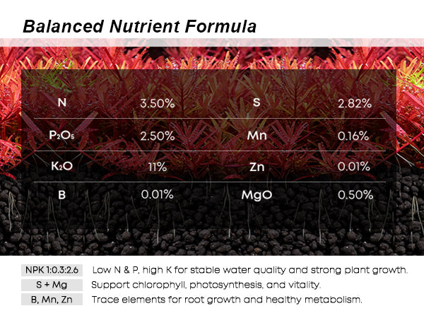 - Optimized NPK Ratio (1 : 0.3 : 2.6οΌοΌFZONE root tabs feature a low-nitrogen, low-phosphorus, high-potassium formula that helps maintain stable water quality while fueling strong plant growth. Designed for freshwater aquariums, they support lush crypts, vibrant sword plants, and dense carpeting plants. Safe for all fish and shrimp.