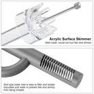 - Features: Adjustable 360° skimmer rod, adjustable flow rate above and below the water line, thin gap inlet design for particle removal