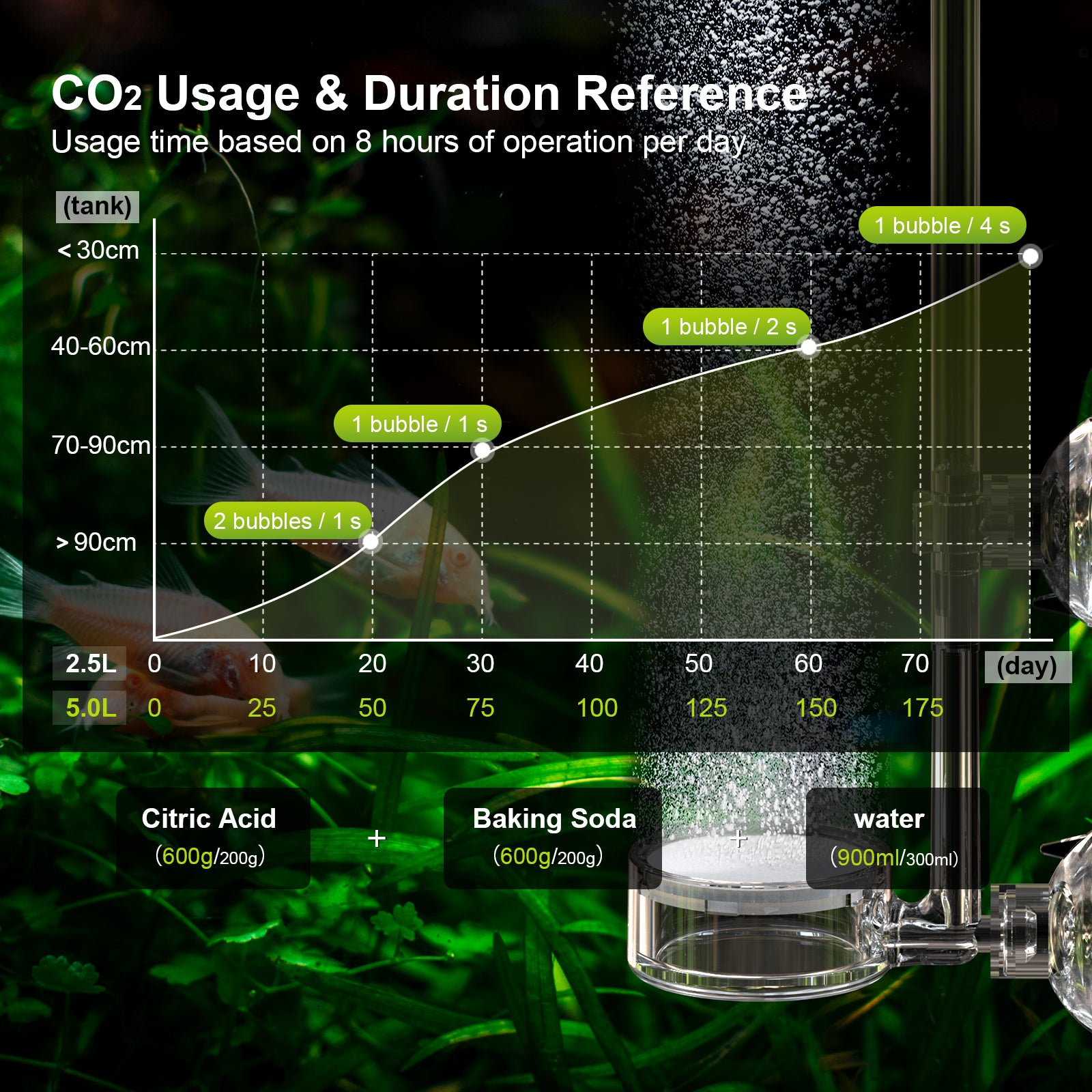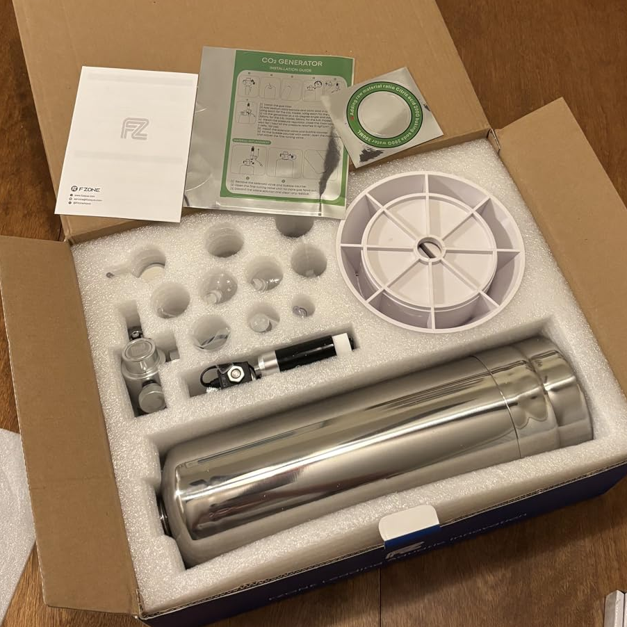 FZONE CO₂ generator system, uses a citric acid and baking soda reaction to produce high-purity CO₂, delivering stable pressure and smooth flow through the regulator, bubble counter, and diffuser, delivering a stable and continuous CO₂ supply to support healthy plant growth in your aquarium.