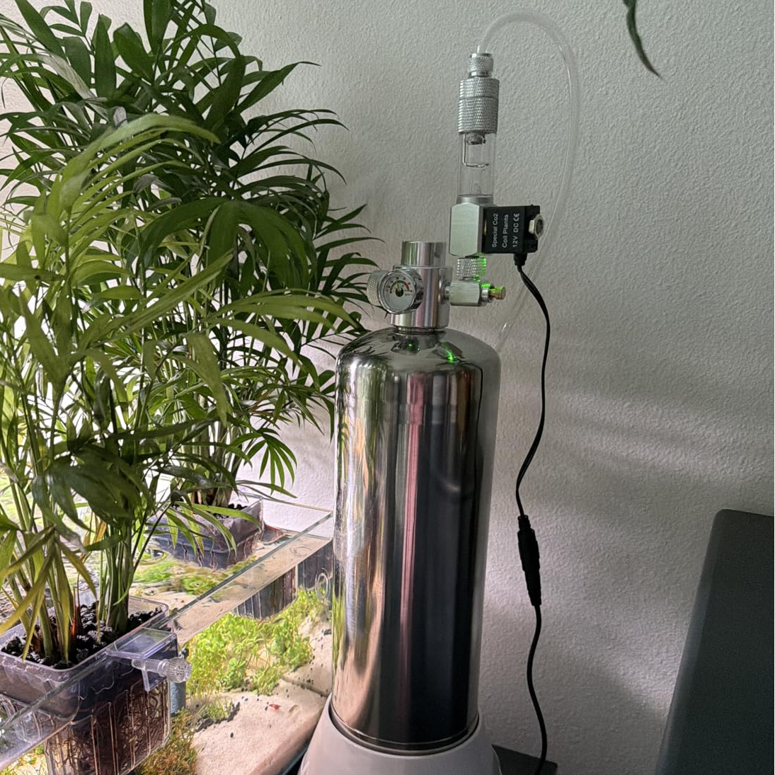 - Includes: CO₂ generator bottle, Regulator unit with solenoid, CO₂ diffuser, Check valve, U-connector, Tubing, Suction cups, Funnel, Syringe, Sealing rings, Power adapter