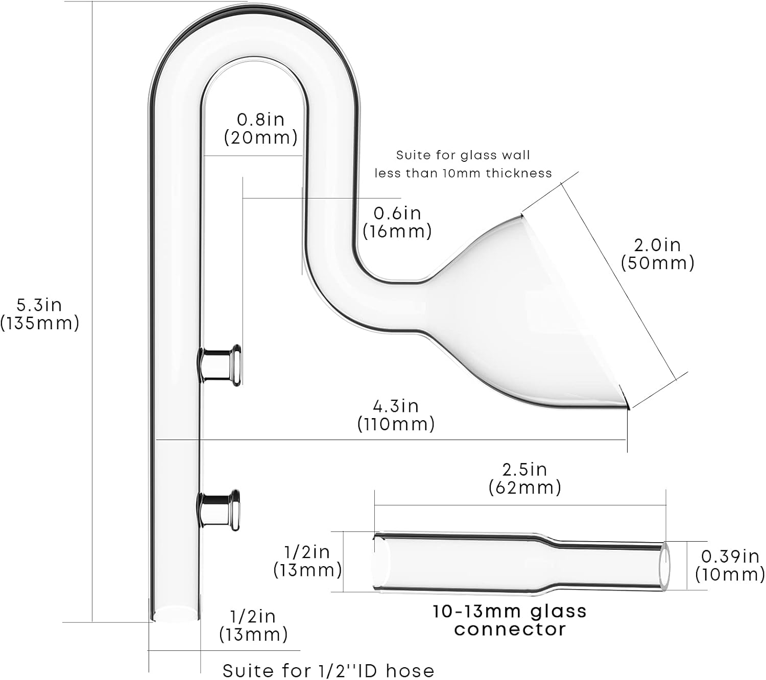 - Includes:Glass skimmer inflow pipe、Glass lily outflow pipe、10–13mm glass adapter、Cleaning brush