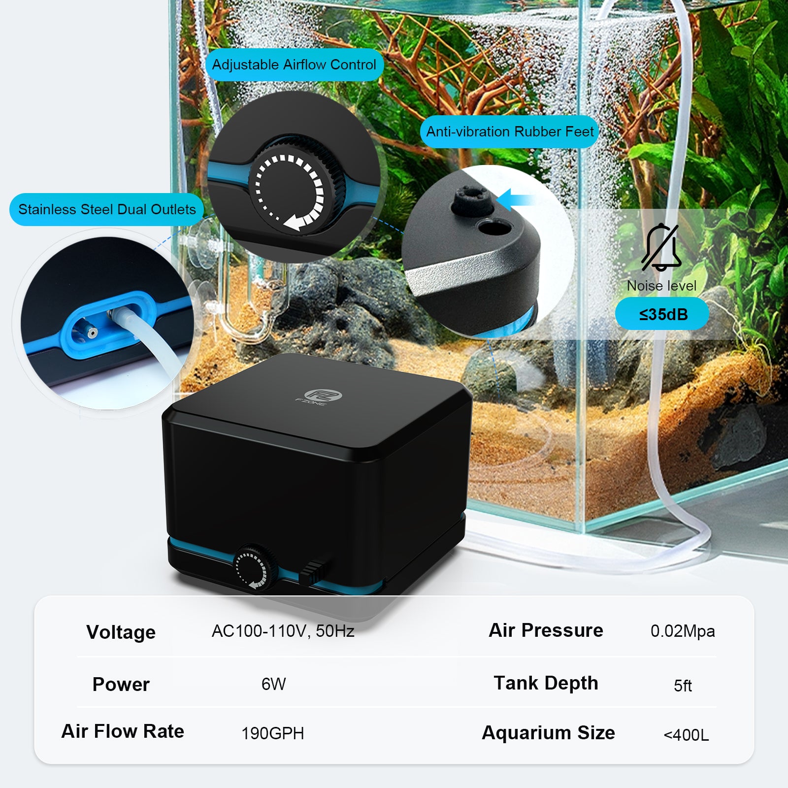 - Powerful & Energy-Efficient Aeration — Delivers 12 L/min airflow and 0.02 MPa pressure for tanks up to 110 gallons, while using only 6W for long-term efficiency.