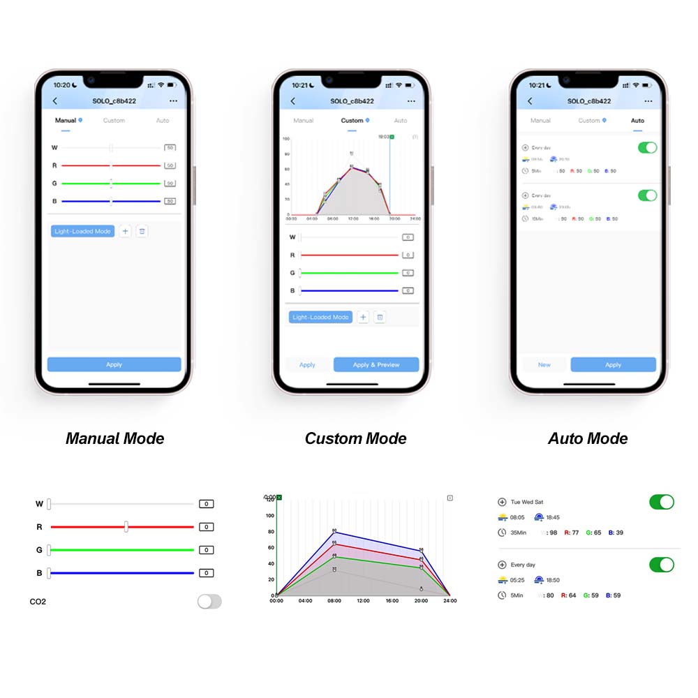 Choose from Manual, Custom, and Auto modes to match your aquarium’s needs. Create personalized sunrise and sunset schedules with up to 24 time points, or simulate natural weather conditions such as sunny, cloudy, or rainy days for a more realistic environment.