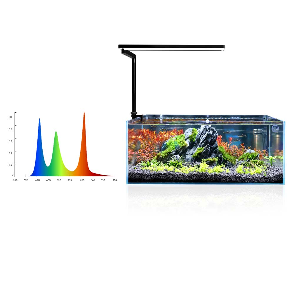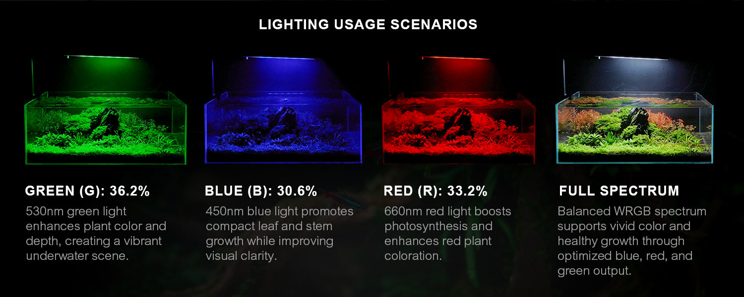 The FZONE aquarium light features WRGB LEDs with independent color channels, delivering balanced light for healthy plant growth and enhanced color for aquariums and terrariums. The optimized LED layout helps provide even coverage and consistent illumination.